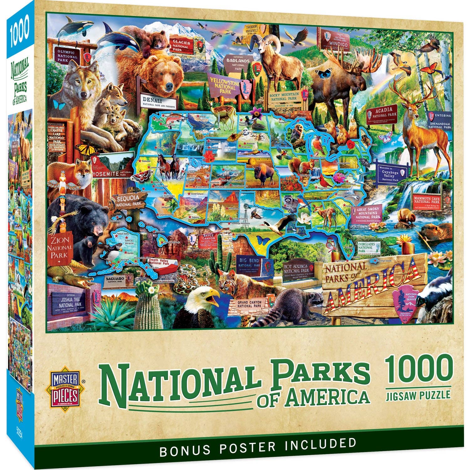This Masterpieces 1000pc Puzzle of the National Parks of America features map of all the National Parks each showing something special in the area. Seek out illustrations of unique animals and places around the states. Each custom-crafted map is incredibly detailed, showing historic places, popular attractions, indigenous wildlife, mountain ranges and much more. These puzzles are made on the highest quality 100% recycled puzzle board and packaged in sophisticated matte-finish display boxes.