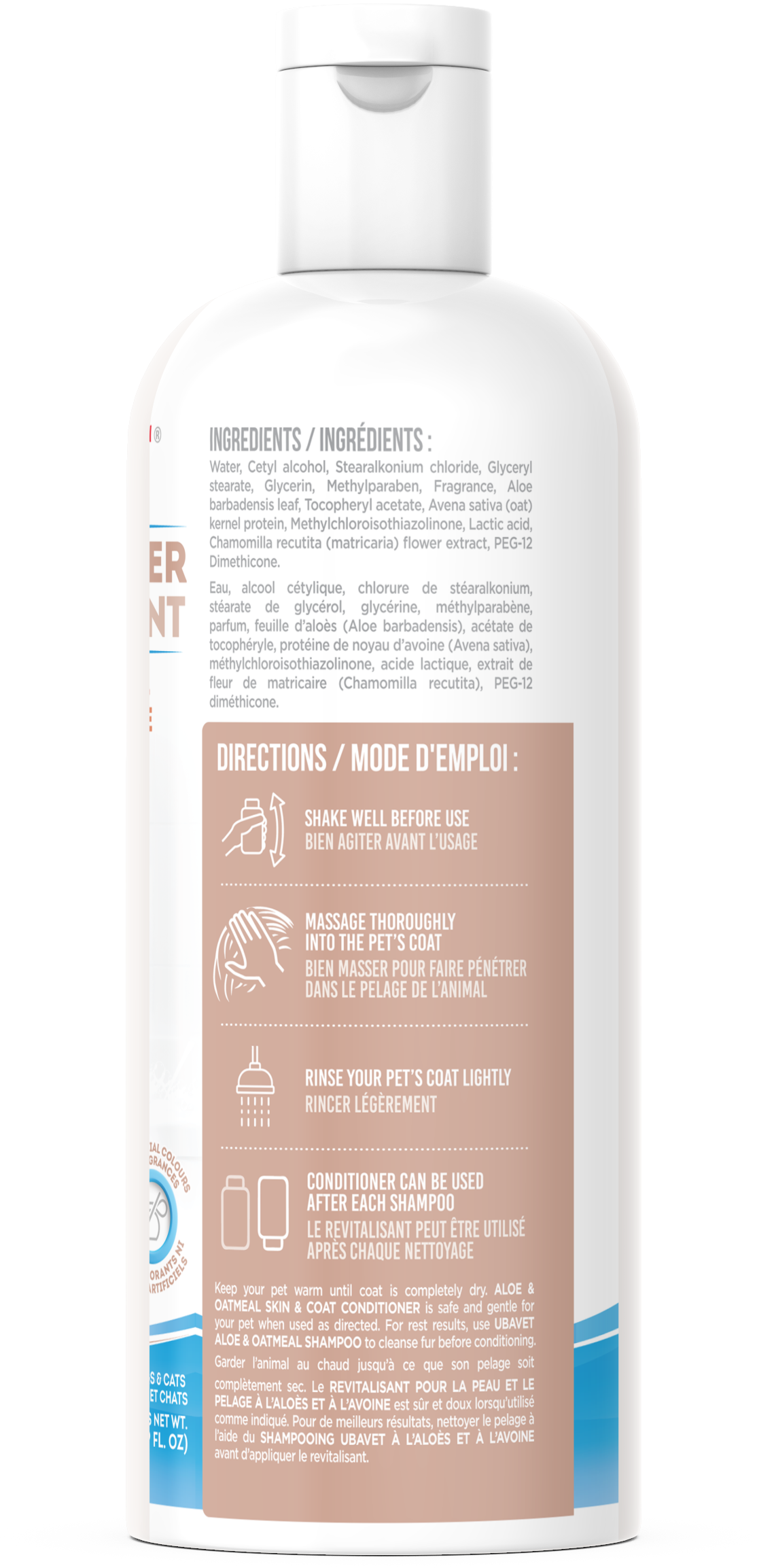 Ubavet Aloe & Oatmeal Conditioner can be used after each shampoo to enhance the natural soothing feel of your pet’s coat. It is designed to work best when used in combination with UBAVET’s Aloe & Oatmeal Shampoo.