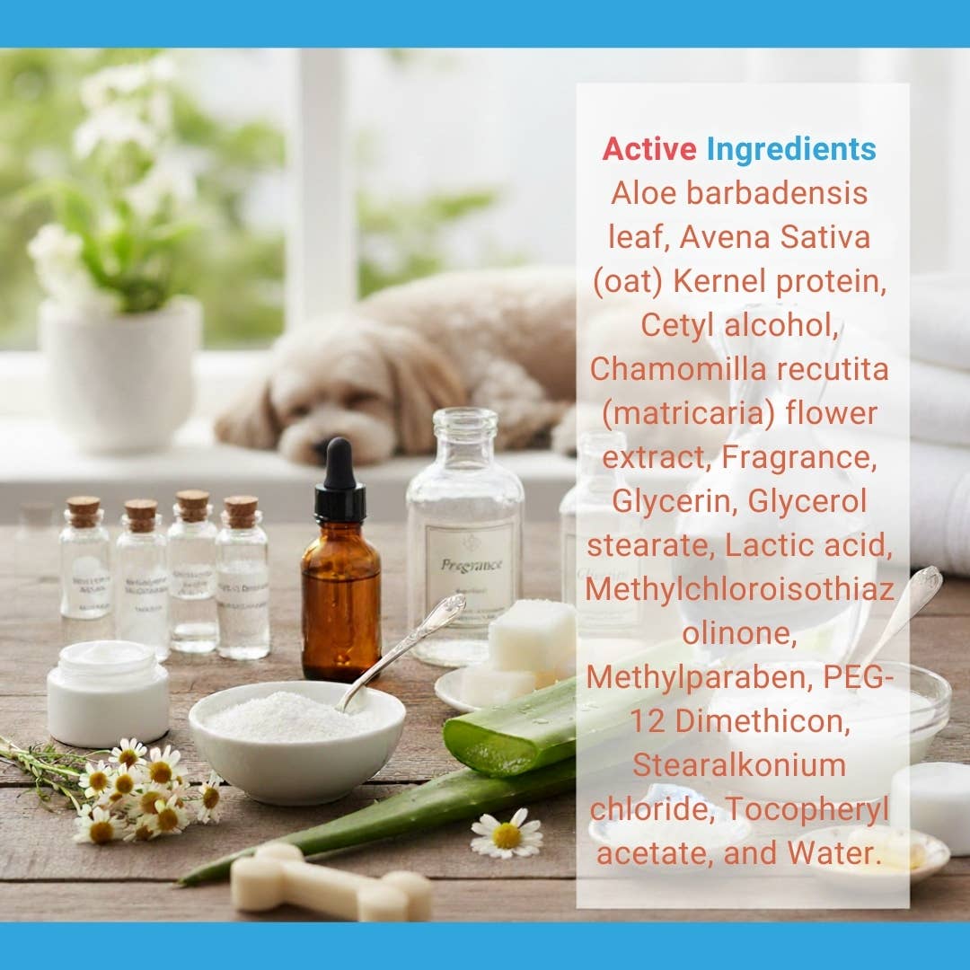 Active ingredients include Aloe barbadensis leaf, Avena Sativa (oat) Kernel protein, Cetyl alcohol, Chamomilla recutita (matricaria) flower extract, Fragrance, Glycerin, Glycerol stearate, Lactic acid, Methylchloroisothiazolinone, Methylparaben, PEG-12 Dimethicon, Stearalkonium chloride, Tocopheryl acetate, and Water.