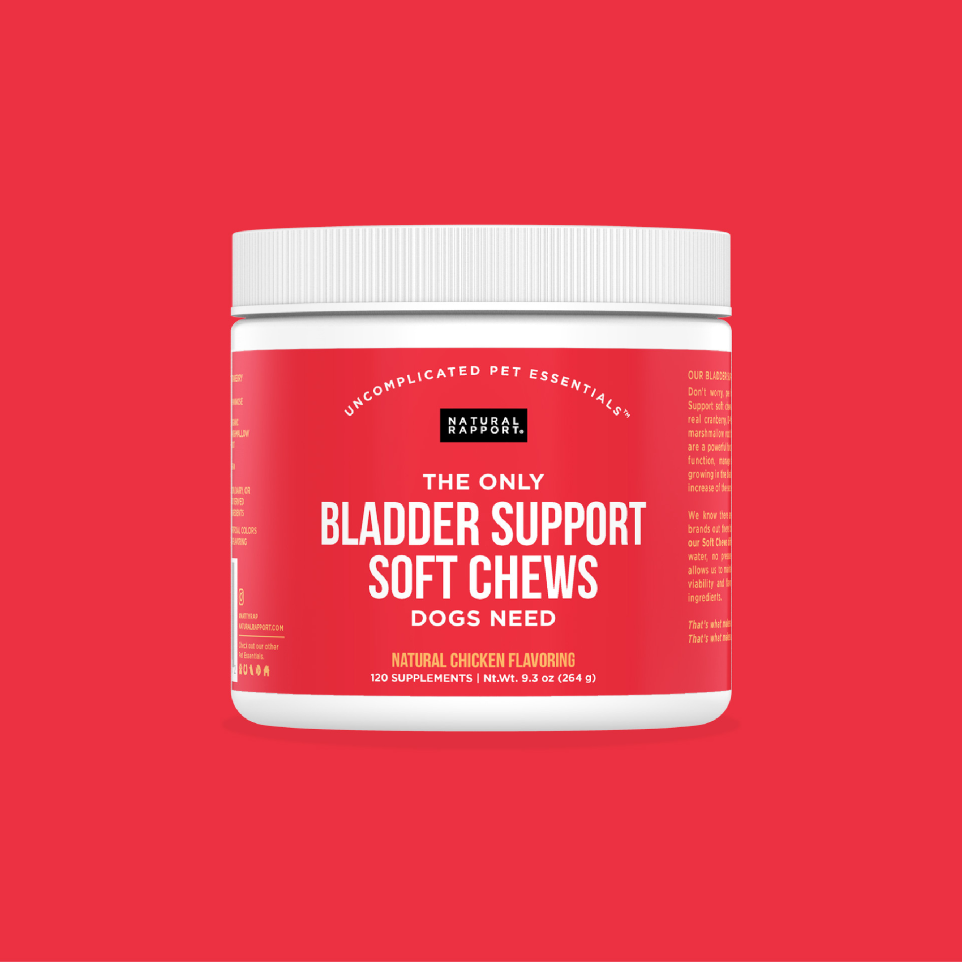 Don’t worry, pee happy! Our Bladder Support soft chews are brimming with real cranberry, D- Mannose and organic marshmallow root that when combined are a powerful force to help aid kidney function, manage bad bacteria from growing in the bladder, and promote an increase in the secretion & flow of urine.